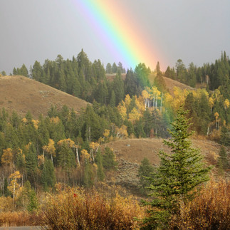 Our drive this week took us to the National Parks. The Tetons and Yellowstone remain crowd favorites even this late into the season. I was surprised by the amount of traffic we encountered exiting the west gate of Yellowstone well past dark. Regardless, we managed to still find quiet moments alone with the remarkable scenery. Our focus this trip was the fall colors, but what we found was even more spectacular! Of course, the pictures don't do justice, but the time of day we were out and about combined with the low clouds and dense, abundant rainfall led to the brightest rainbow either of us had seen! The colors were like neon and we couldn't stop exclaiming over the magnitude at which the rainbow shined. It's translucence was visible as it passed hills and trees, but just above the ground and into the sky, the rainbow dominated our vision, captivating our view. We thought the experience would be short-lived but instead the rainbow persisted for a half-hour at least, and with every passing minute becoming brighter and brighter.