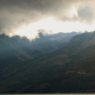 The evening light shone into the yellow and orange foliage of the valley, truly a golden hour as the whole landscape shone before us. We found peace. The drive through the thick trees in the north area of Teton National Park was so calming as we passed through a shaded corridor with patches of golden light flashing in our eyes ever so softly. The light, pouring under the thick clouds above the mountains, illuminated the deep narrow glacial valleys of the Tetons. These rugged peaks appear so different in unique lighting. Certain features are accented when the main peaks are hidden from view. For my artist eye, this drive was like candy at every turn!